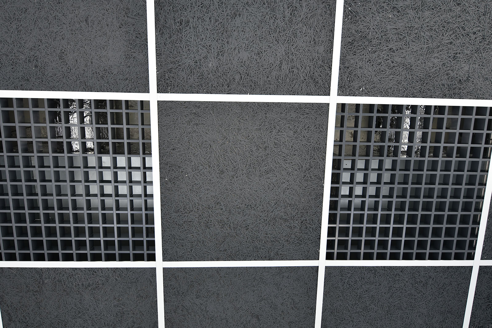 Ten projekt idealnie demonstruje korzyści sufitu rastrowego o kształcie "Trójkątny", łącząc funkcjonalność oraz elegancki design