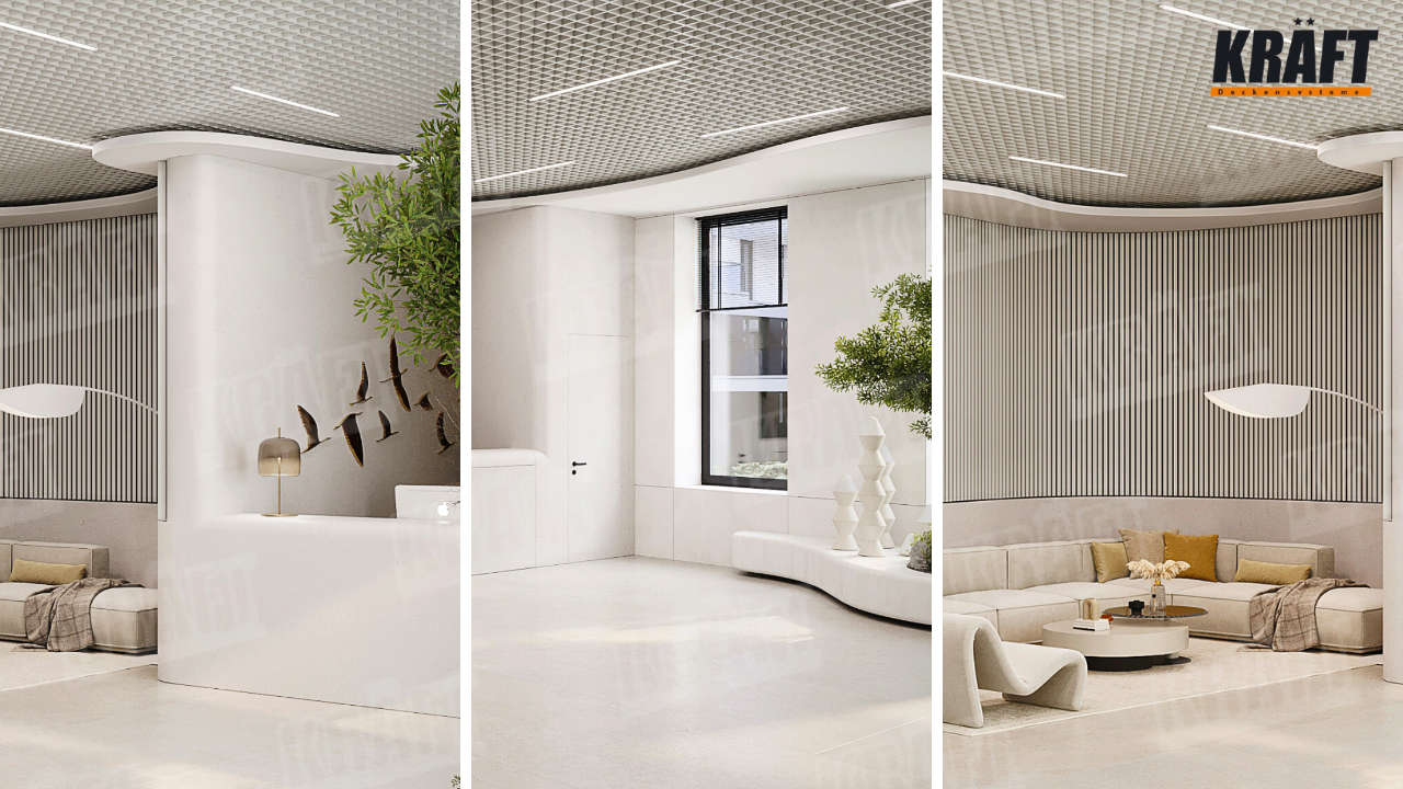 In this project, the KRAFT GLK Cassette Open Cell Ceiling became a central element of the architectural concept. Its precise geometry creates rhythm and order, adding a sense of depth and harmony to the interior. The slim 15 mm T-profile ensures visual accuracy and lightness, while the metallic finish highlights the contemporary character of the design.