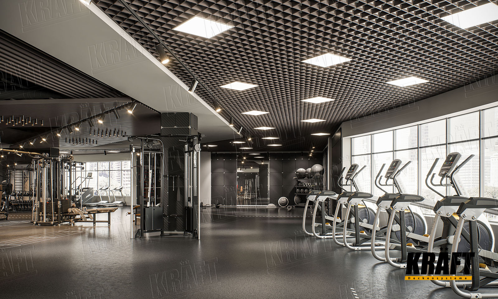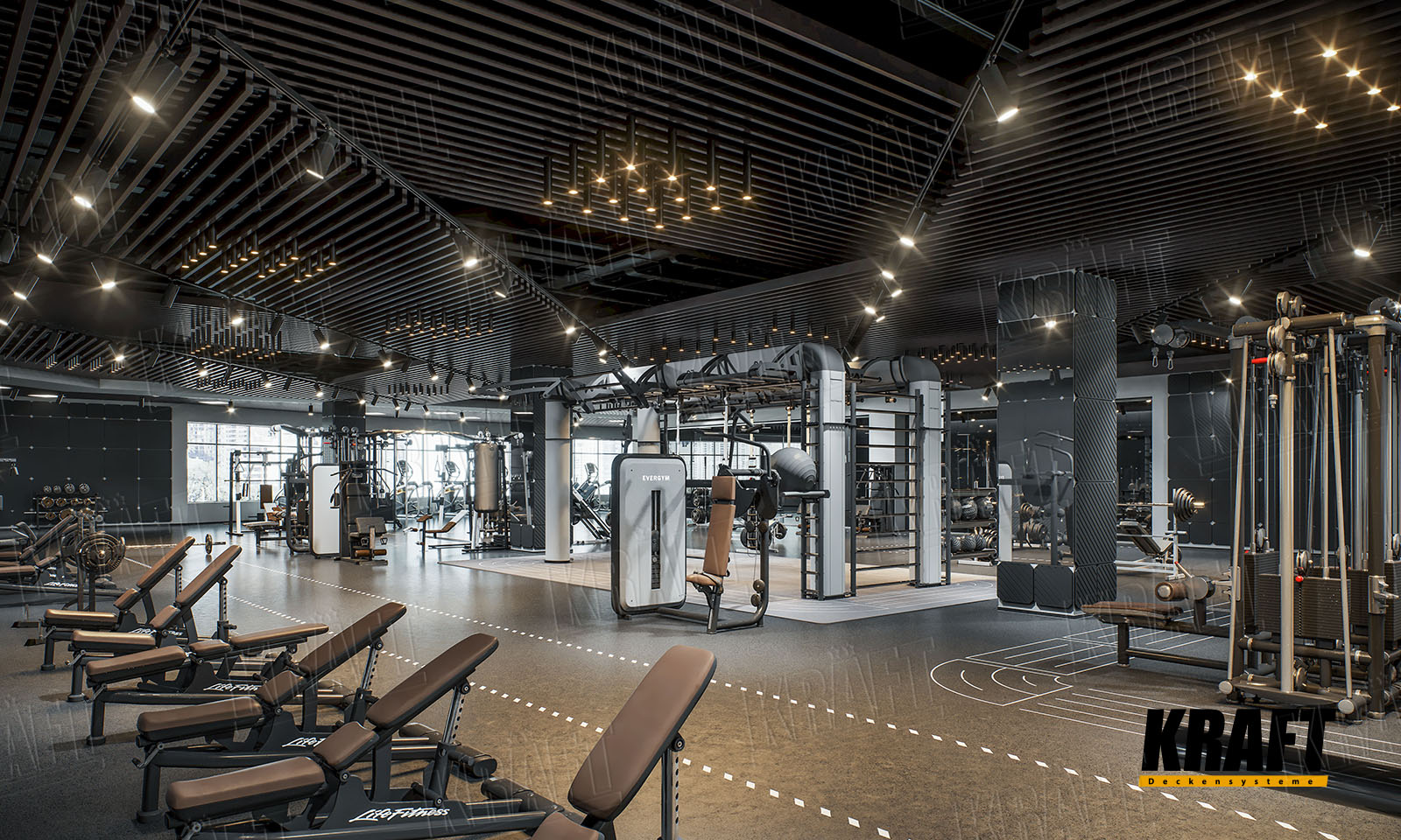The gym can utilize virtually all ceiling types from KRAFT's range - open-cell ceilings, rail ceilings, or T-profile systems, each offering unique advantages.
