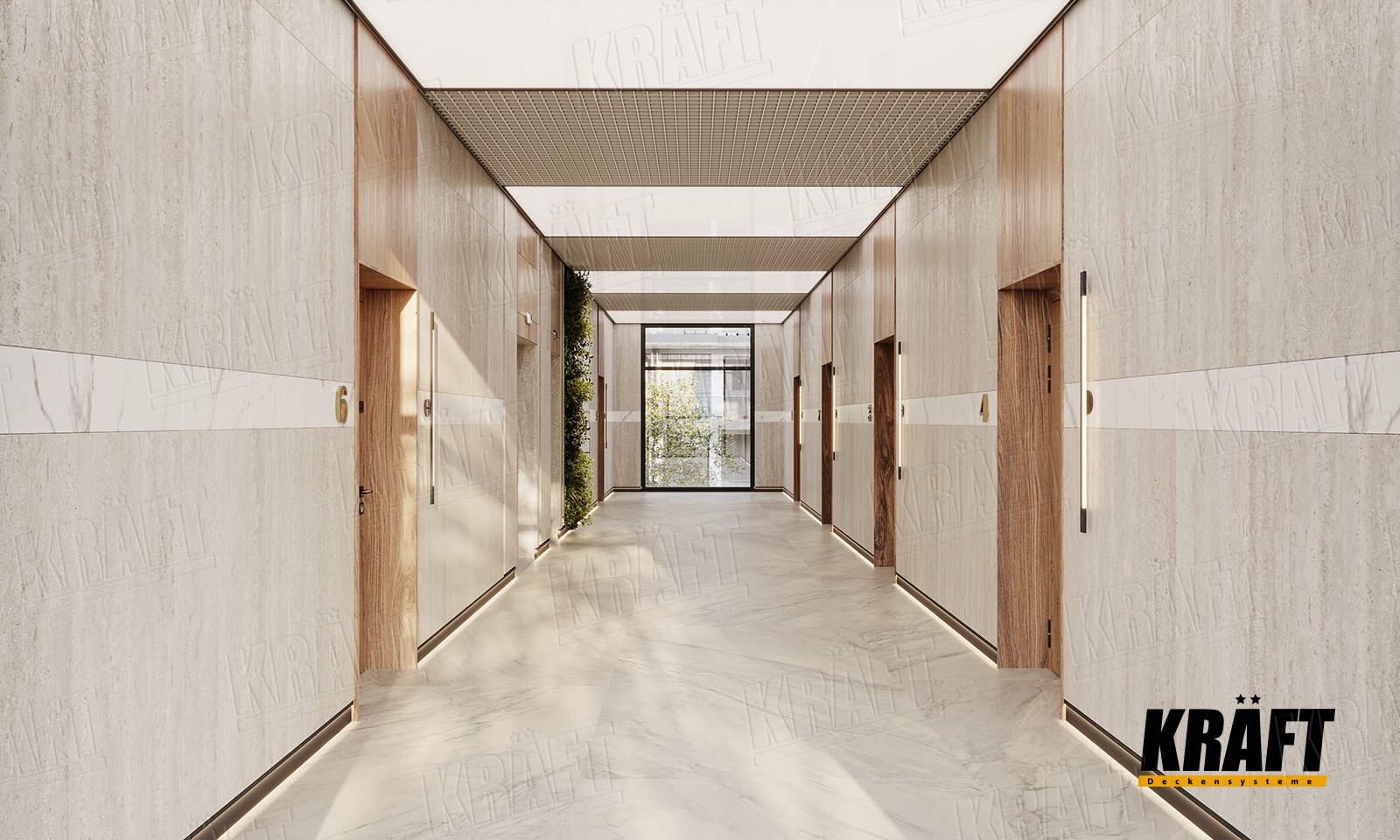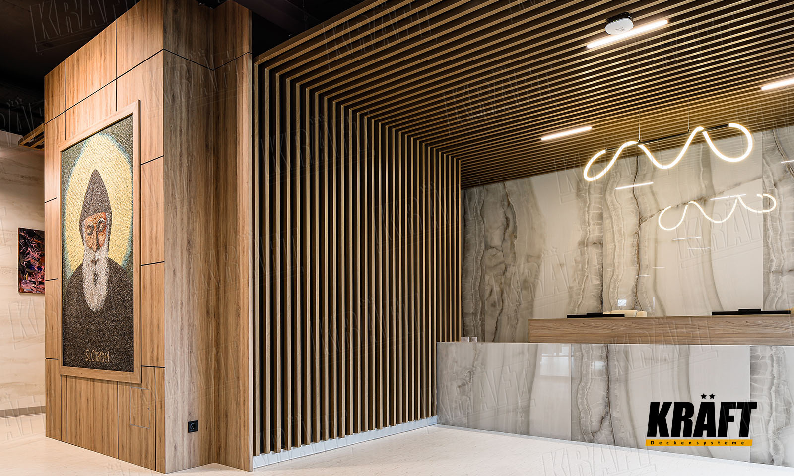 KRAFT suspended ceilings offer comprehensive benefits across their entire product range. Built to meet high public safety standards, all KRAFT suspended ceiling models - including linear strip ceilings, open-cell systems, T-profile-based ceilings, and specialized tiles and panels - utilize high-quality, eco-friendly materials.