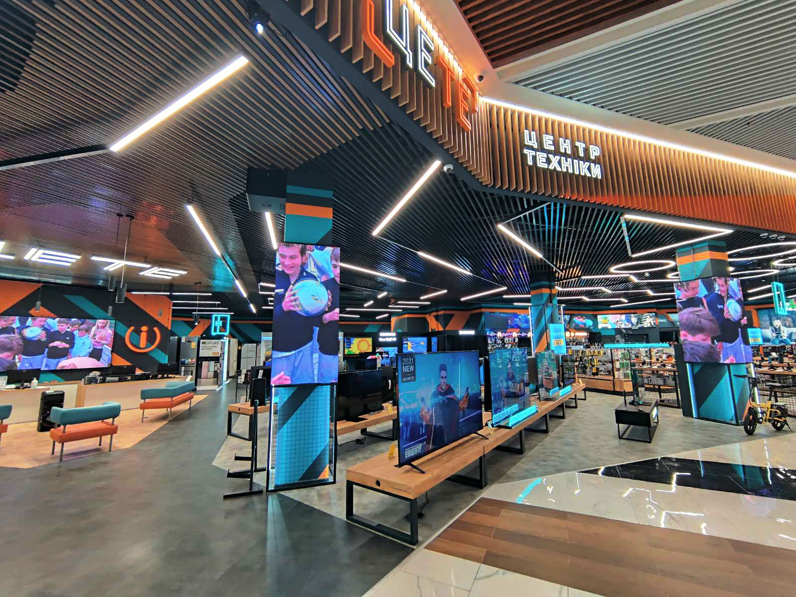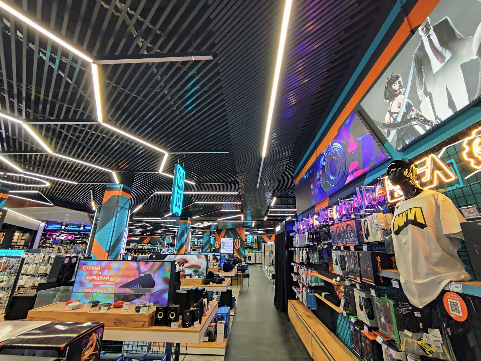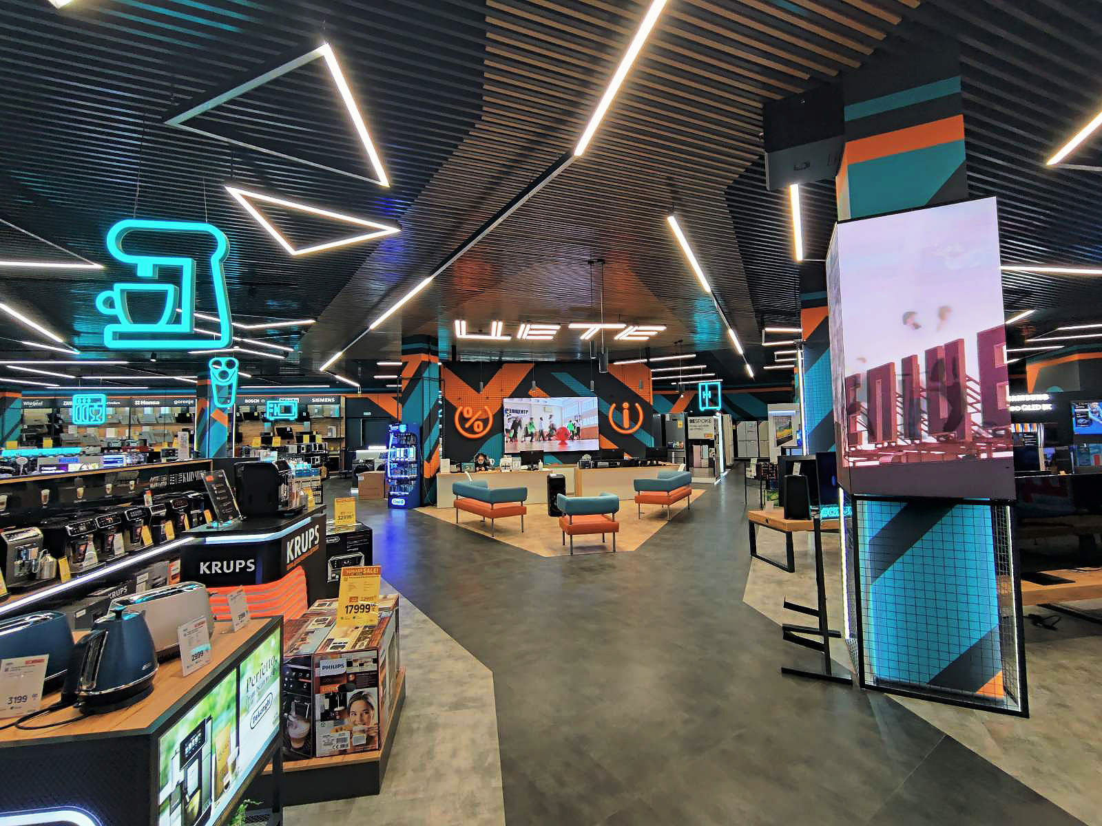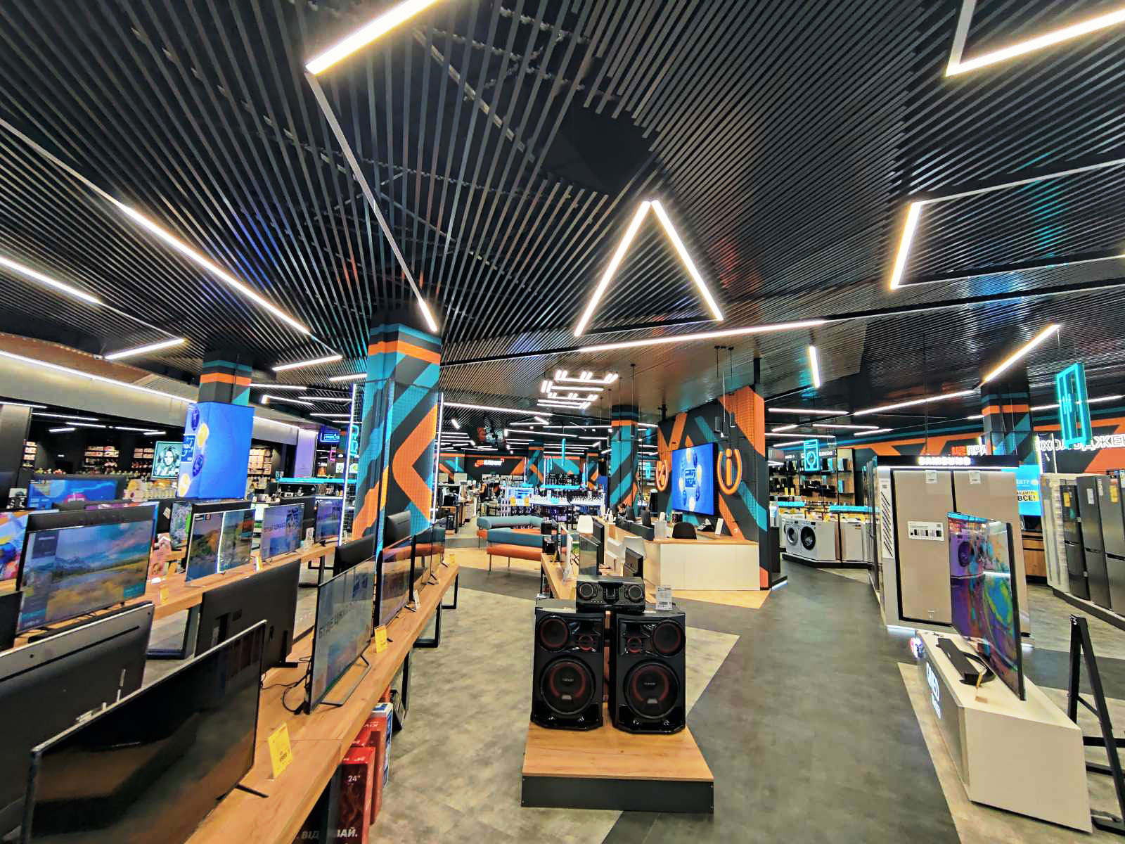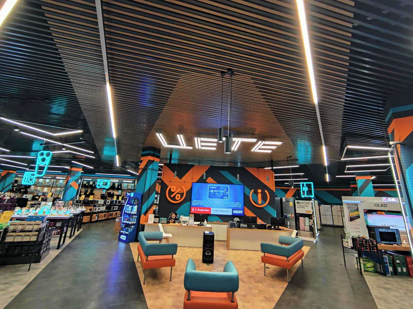 Salon sprzedaży w sklepie sieciowym RTV i AGD "CeTe" nie ma zbyt dużego pola do popisu, jeśli chodzi o design, ponieważ większość miejsca zajmują same urządzenia. I właściwie jedynymi elementami, z którymi projektant może pracować są kolumny i sufit. Pomimo ograniczonego zakresu narzędzi projektowych, projektantom udało się stworzyć jednolity styl pomieszczenia. Sufit listwowy KRAFT w znacznym stopniu wpływa na ogólny wygląd pomieszczenia - reszta wnętrza wspiera całokształt wyglądu.