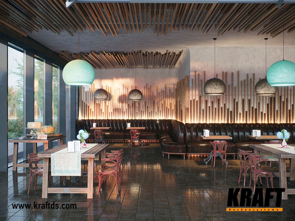 W rzeczywistości długość, szerokość, wysokość, rozstaw i kolor można łączyć jeśli chodzi o listwę kubiczną. W tym pomieszczeniu projektant postanowił pójść "na całość", więc w połączeniu są prawie wszystkie te parametry, z wyjątkiem szerokości listwy. Listwa kubiczna KRAFT o szerokości 35 mm i wysokości od 35 do 105 mm stosowana jest do sufitów podwieszanych i ścian. Długość listwy waha się od 60 cm do 2,2 m. Aby stworzyć bardziej przytulną atmosferę, listwy z efektem drewna są dostępne w dwóch popularnych kolorach Sonoma (jasny) i Golden Oak (ciemny), czyli w tych samych odcieniach, co stoły w pokoju. Miękkie, dyskretne oświetlenie odbijające się od listew tworzy efekt falowania. Ogólnie rzecz biorąc, projekt pokoju wygląda bardzo harmonijnie i jednolicie.