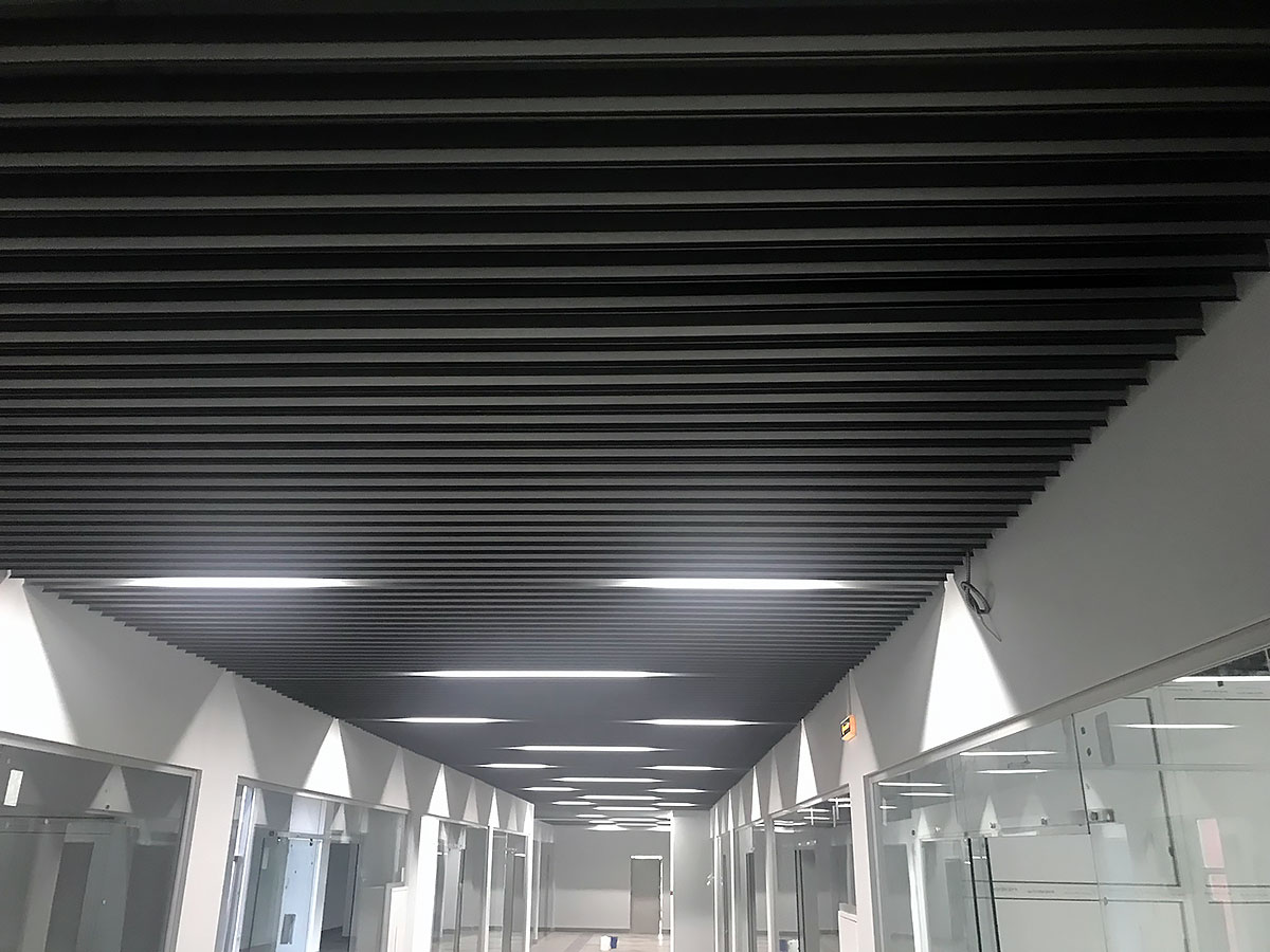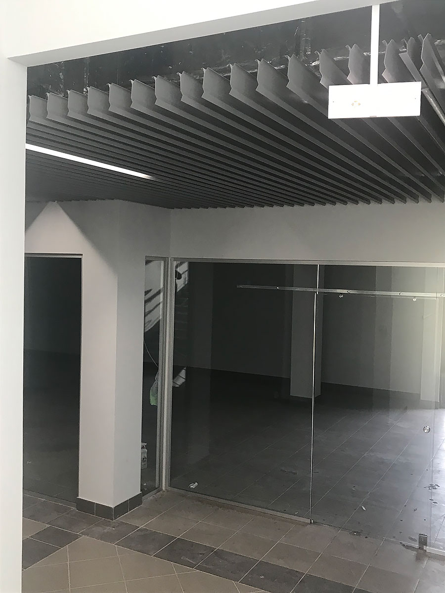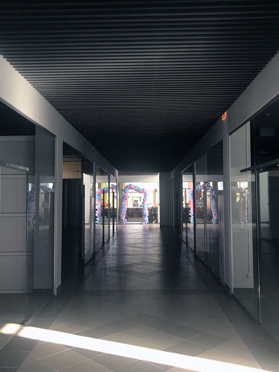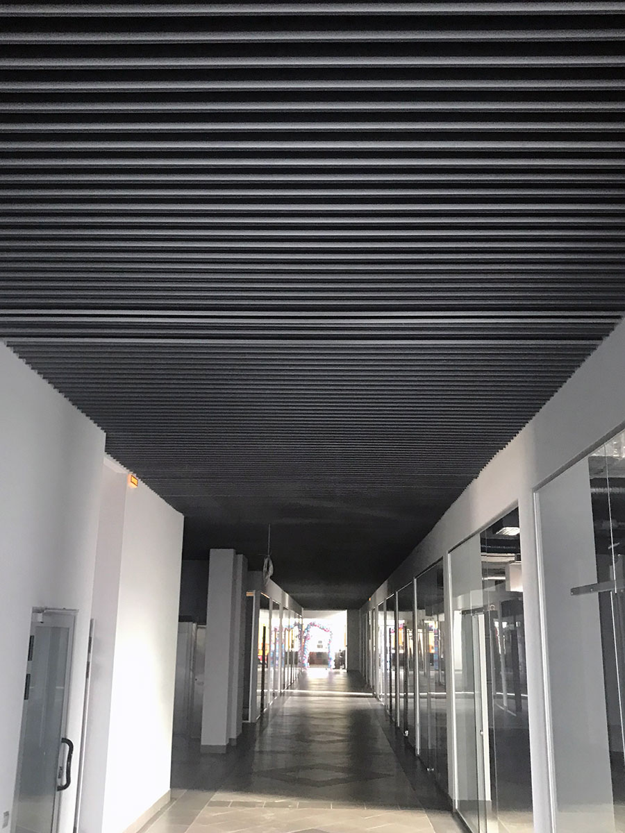 W alejkach i korytarzach galerii jako sufit wybrano listwę  plaską KRAFT o wysokości 100 mm i grubości 104 mm w kolorze głębokiej czerni z kątowym zagięciem końca.  Zagięcie listwy ma na celu zwiększenie obszaru zachodzenia na przestrzeń sufitu i nadanie sufitowi dodatkowej objętości.  Jak widać na zdjęciu, w ogólnym układzie listwa wygląda jednolicie i doskonale zasłania komunikację pod sufitem.  Montaż i demontaż sufitu szafy jest jednym z najprostszych, więc dostęp do komunikacji jest dość prosty.  Ponadto taki strop nie zakłóca działania systemów oddymiania i gaśniczych.