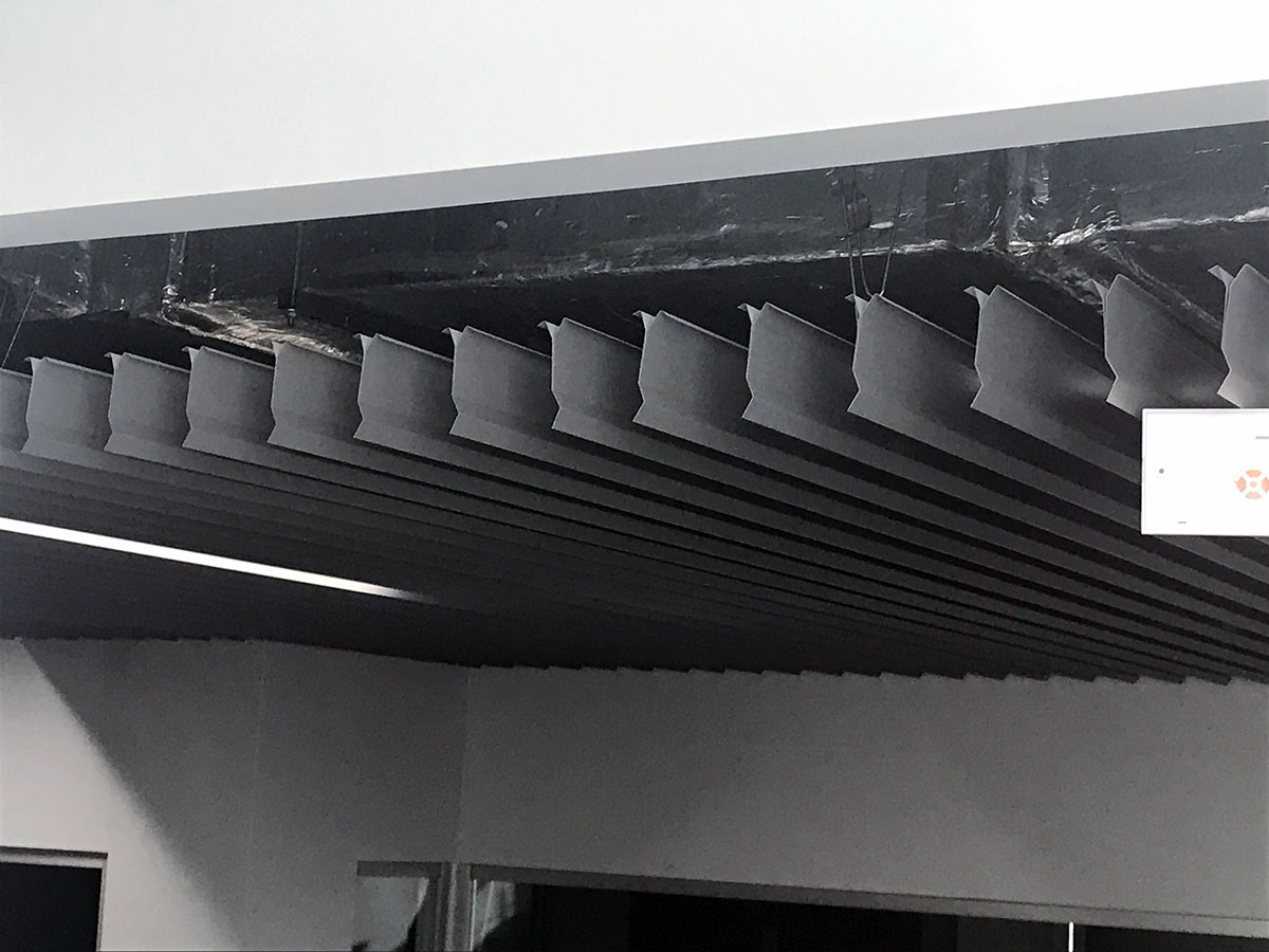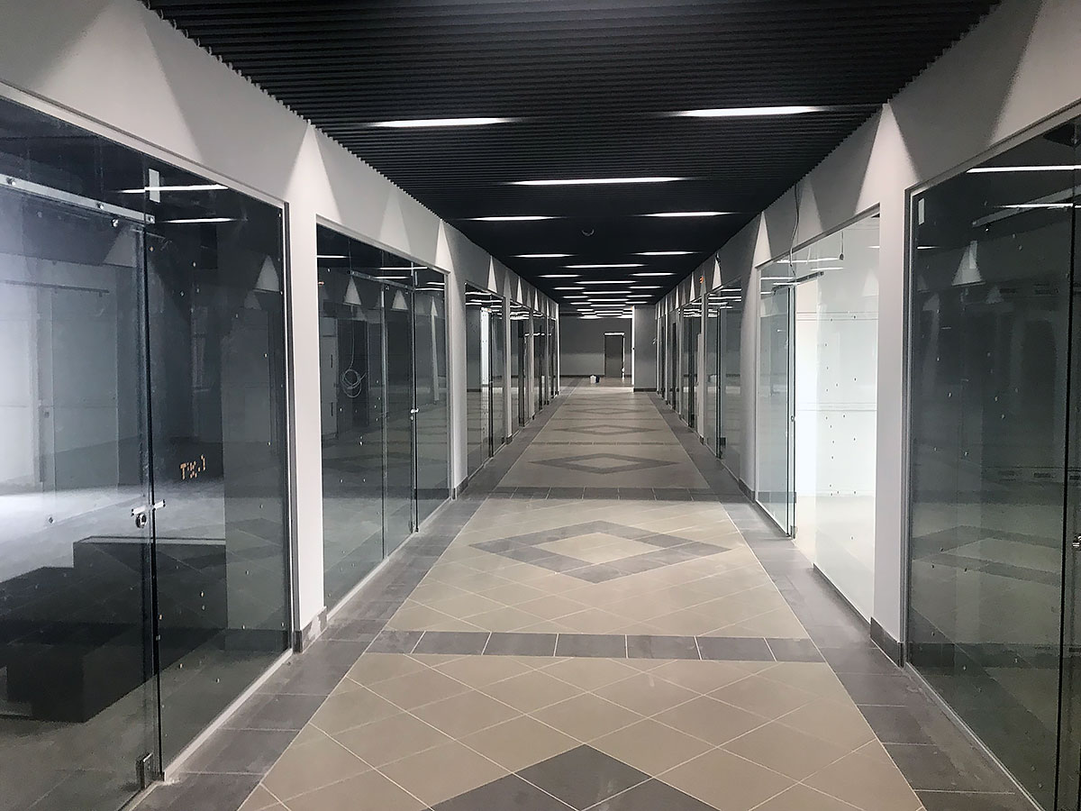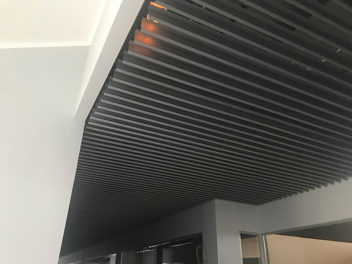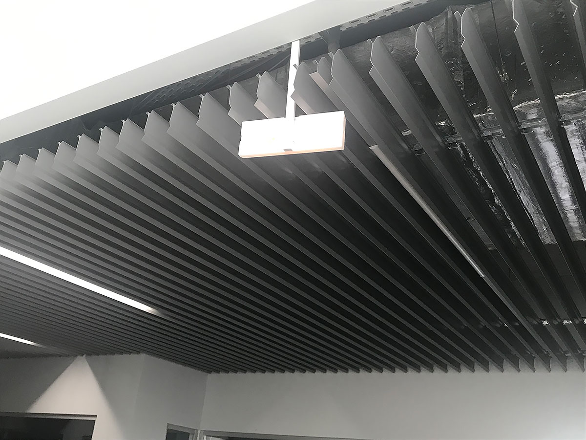 W alejkach i korytarzach galerii jako sufit wybrano listwę  plaską KRAFT o wysokości 100 mm i grubości 104 mm w kolorze głębokiej czerni z kątowym zagięciem końca.  Zagięcie listwy ma na celu zwiększenie obszaru zachodzenia na przestrzeń sufitu i nadanie sufitowi dodatkowej objętości.  Jak widać na zdjęciu, w ogólnym układzie listwa wygląda jednolicie i doskonale zasłania komunikację pod sufitem.  Montaż i demontaż sufitu szafy jest jednym z najprostszych, więc dostęp do komunikacji jest dość prosty.  Ponadto taki strop nie zakłóca działania systemów oddymiania i gaśniczych.