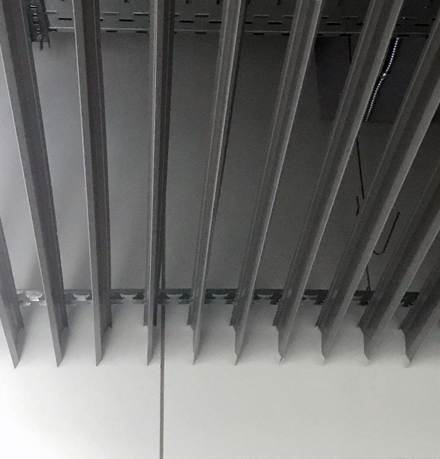Jedną z zalet sufitów listwowych jest to, że można wykonać ukrytą instalację systemu oświetleniowego.  W tym przypadku do montażu osprzętu zastosowano szynę lamelową o wysokości 50 mm z płaskim zagięciem końca do mocowania osprzętu (patrz przedostatnie zdjęcie).  Przy tej instalacji w stanie wyłączonym lampy są praktycznie niewidoczne.  A kiedy oświetlenie jest włączone, bezpośrednie światło nie razi odwiedzających w oczy.  Również w celu uzyskania bardziej równomiernego oświetlenia zdecydowaliśmy się na naprzemienne zestawy opraw 2x600 mm i 1x1200 mm.