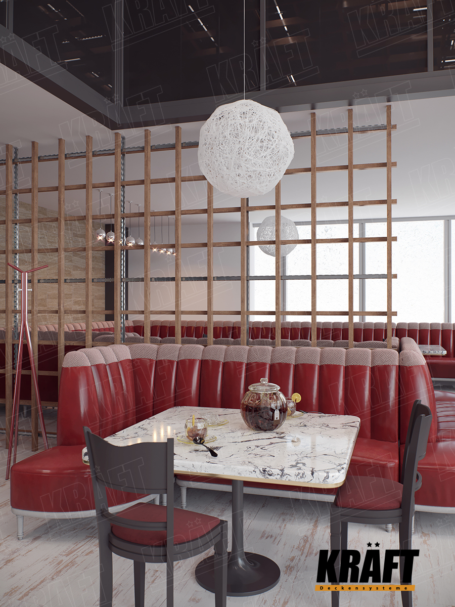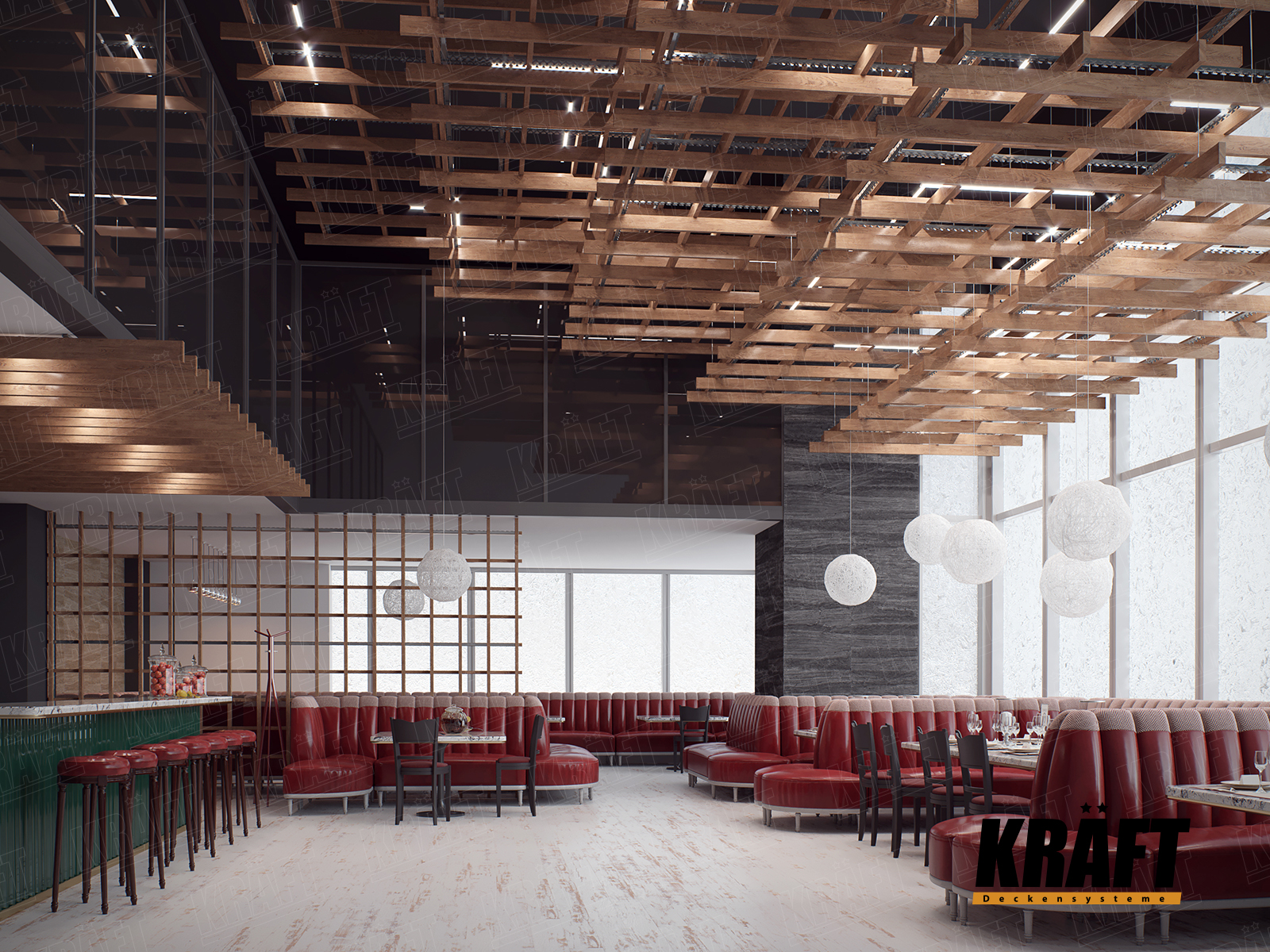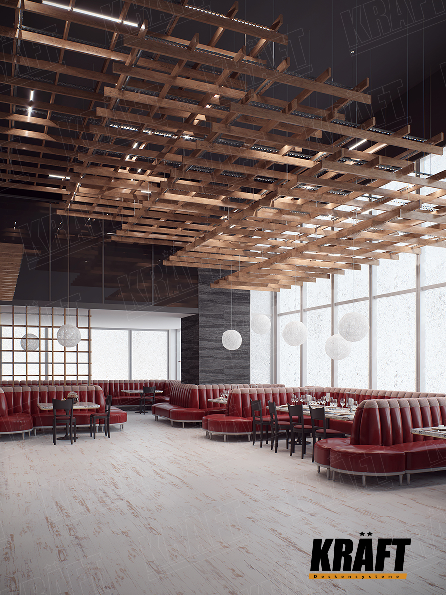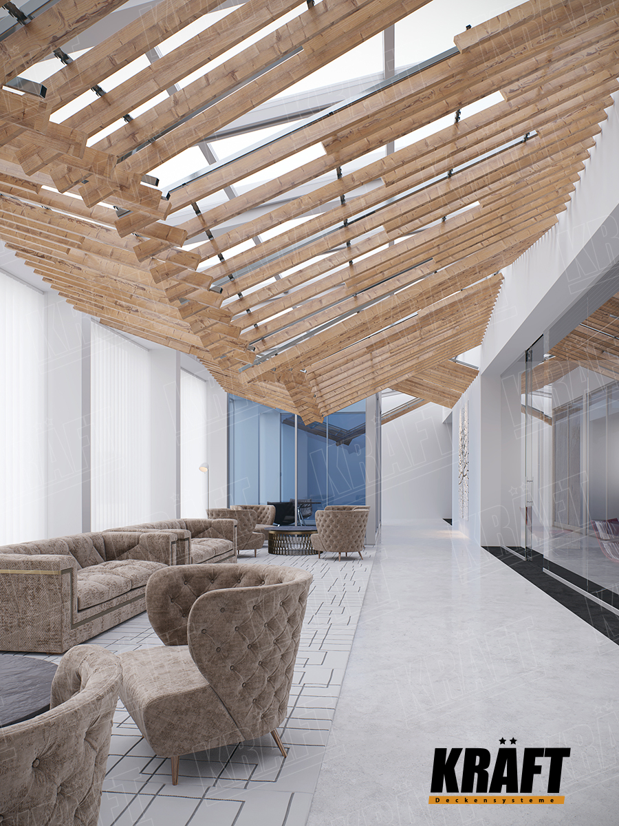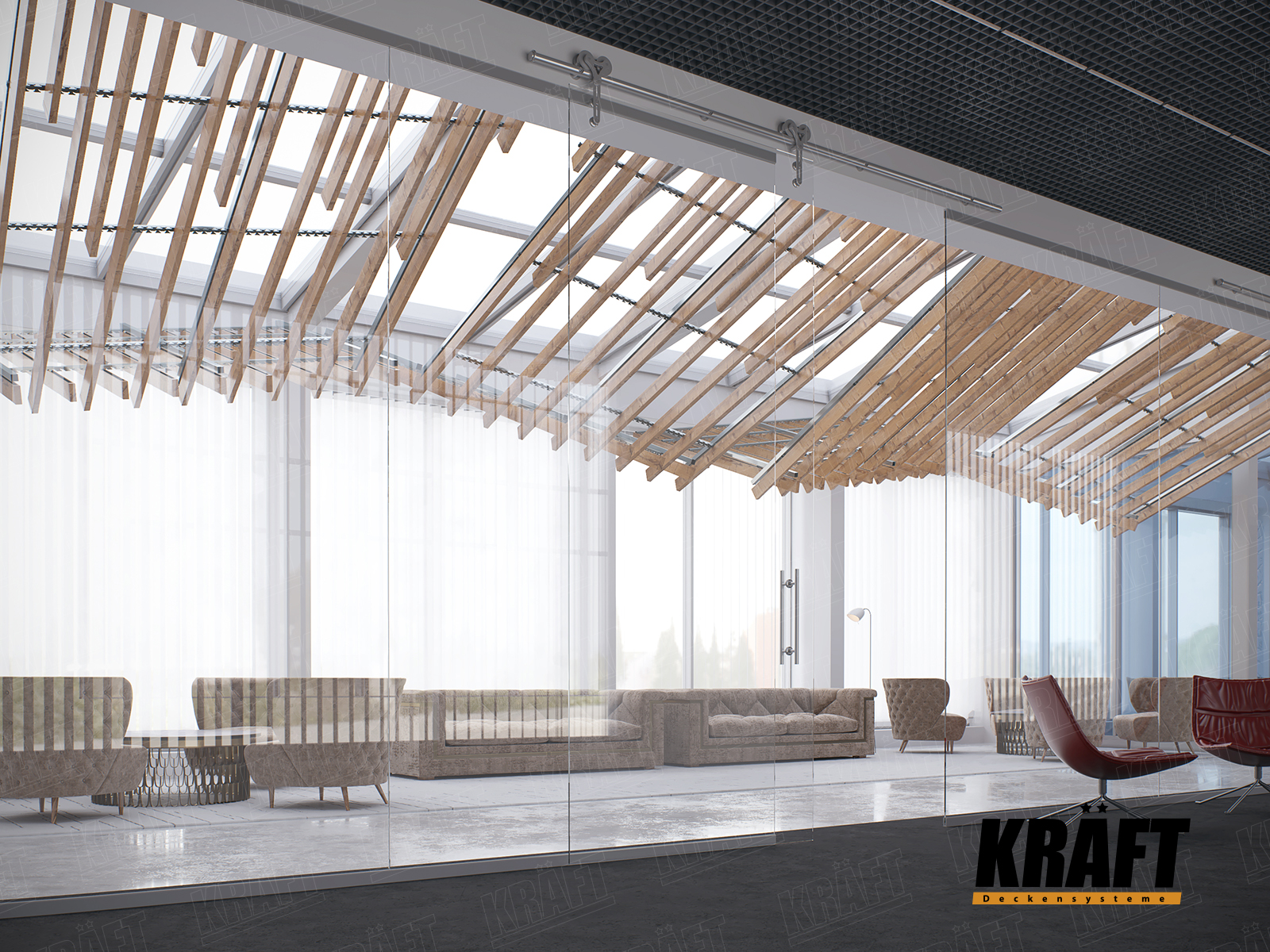 Sufity listwowe są popularne wśród projektantów, ponieważ można je dopasować do każdego stylu wnętrza - od klasycznego do loftowego. Oczywiście najpopularniejszym materiałem na sufit z listew jest drewno. Nie ma sensu próbować wymieniać wszystkich zalet drewnianego sufitu - jest ich naprawdę wiele. Co jednak zrobić, gdy trzeba przestrzegać przepisów przeciwpożarowych, a bardzo chciałoby się zobaczyć drewnianą listwę sufitową? Na poniższych ilustracjach pokazaliśmy, że istnieje bezpieczna alternatywa dla drewnianego sufitu - sufit designerski wykonany z metalowej listwy o fakturze drewna.