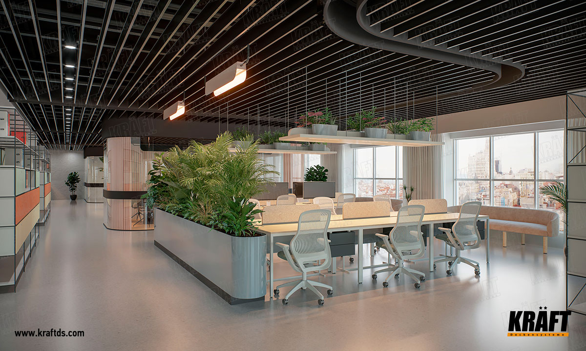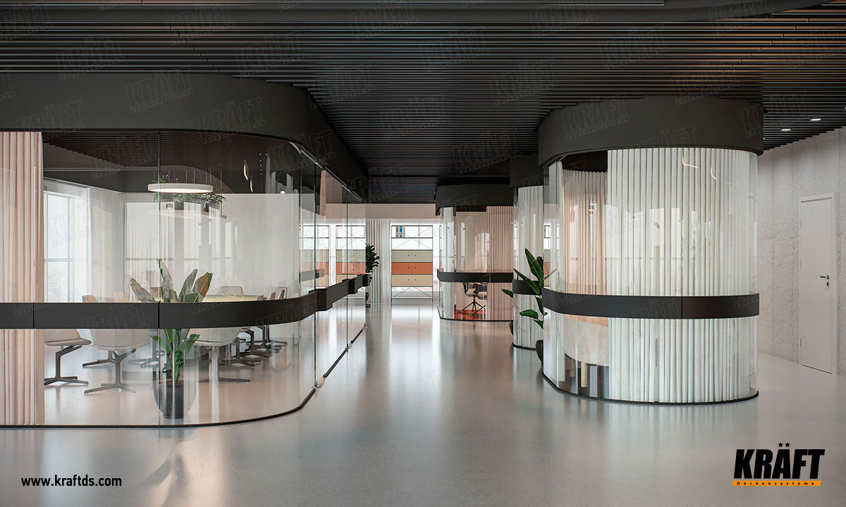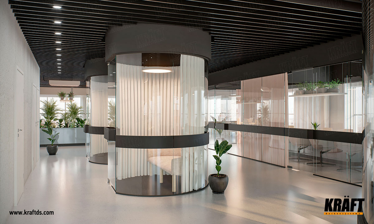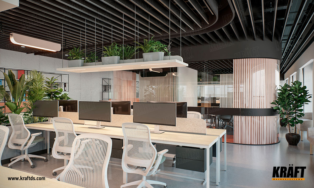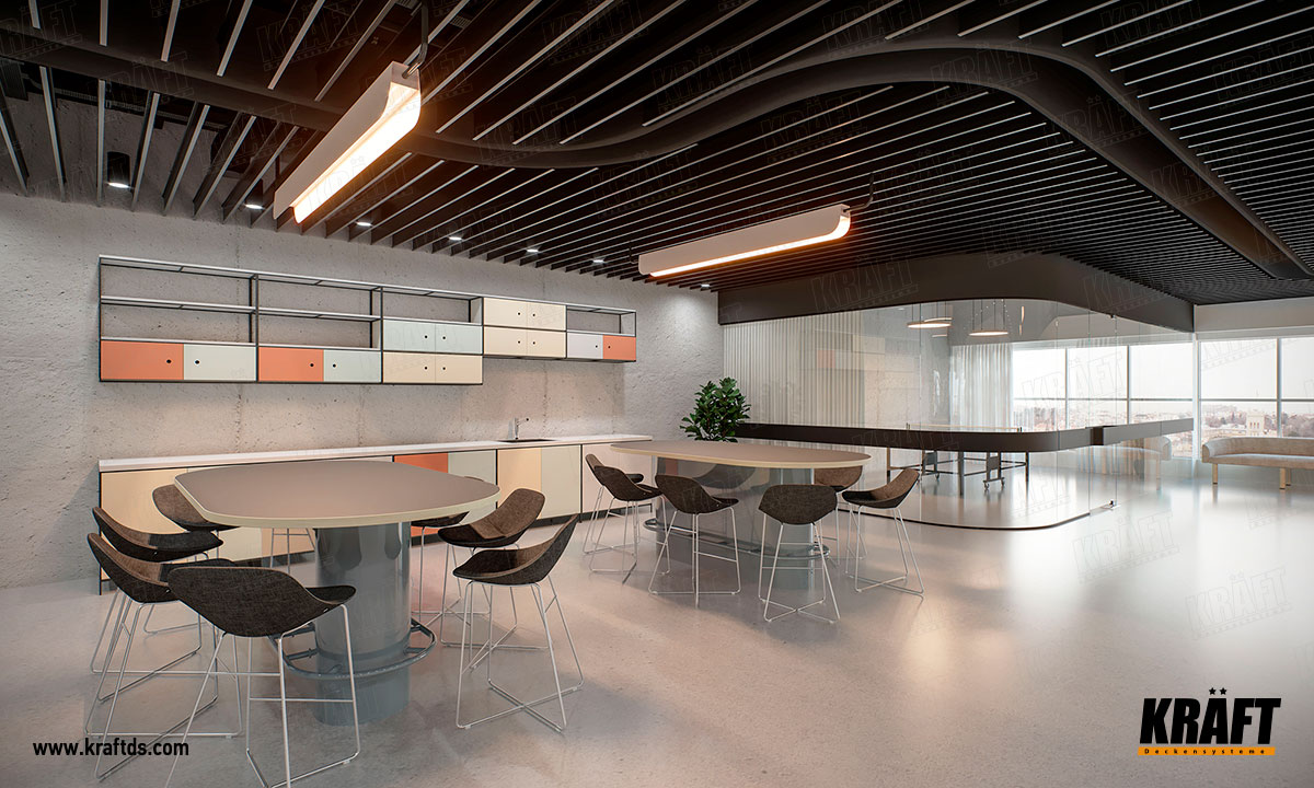 Jak widać na zdjęciu, postanowiliśmy w miarę możliwości pozbyć się negatywnej energii w biurze. Szklane ściany i przegrody, sofy, donice, stoły do jadalni, oprawy sufitowe i inne elementy wnętrza po zaokrągleniu ostrych krawędzi wyglądają nie tak groźnie :). Aby spotęgować efekt, płynne linie zostały powtórzone nawet na suficie. Wydawałoby się, że sufit ekranowy KRAFT to nic innego jak płaskie listwy, jak można je zaokrąglić?Wszystko jest możliwe, gdy się do tego przyłożysz. Kształt sufitu podwieszanego KRAFT podąża za krzywiznami powierzchni w biurze i naszym zdaniem promieniuje pozytywną energią!