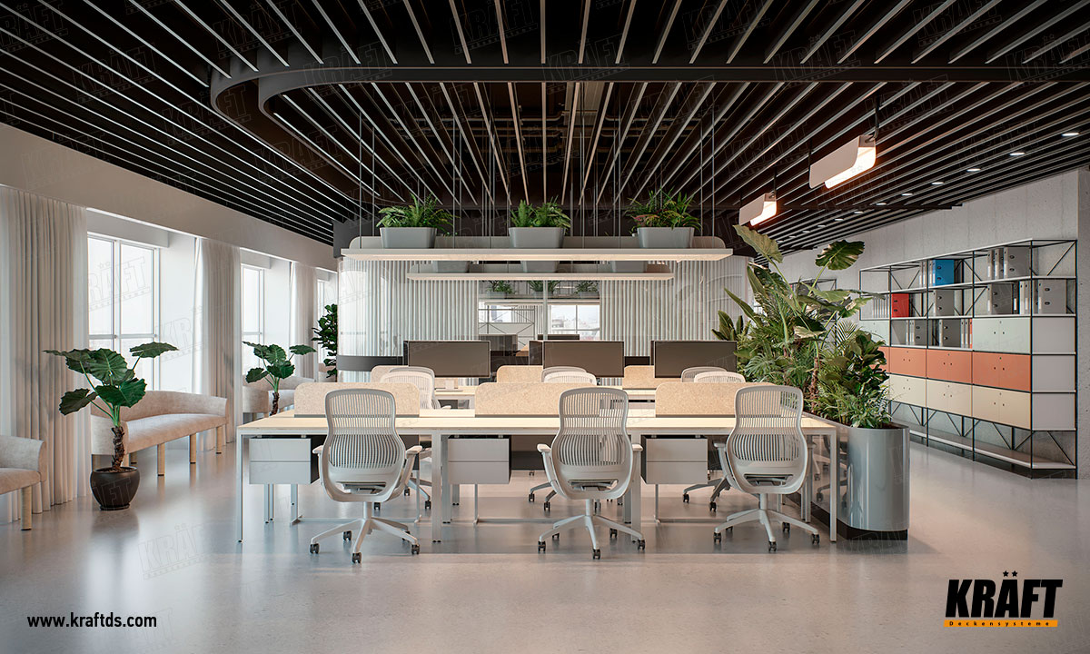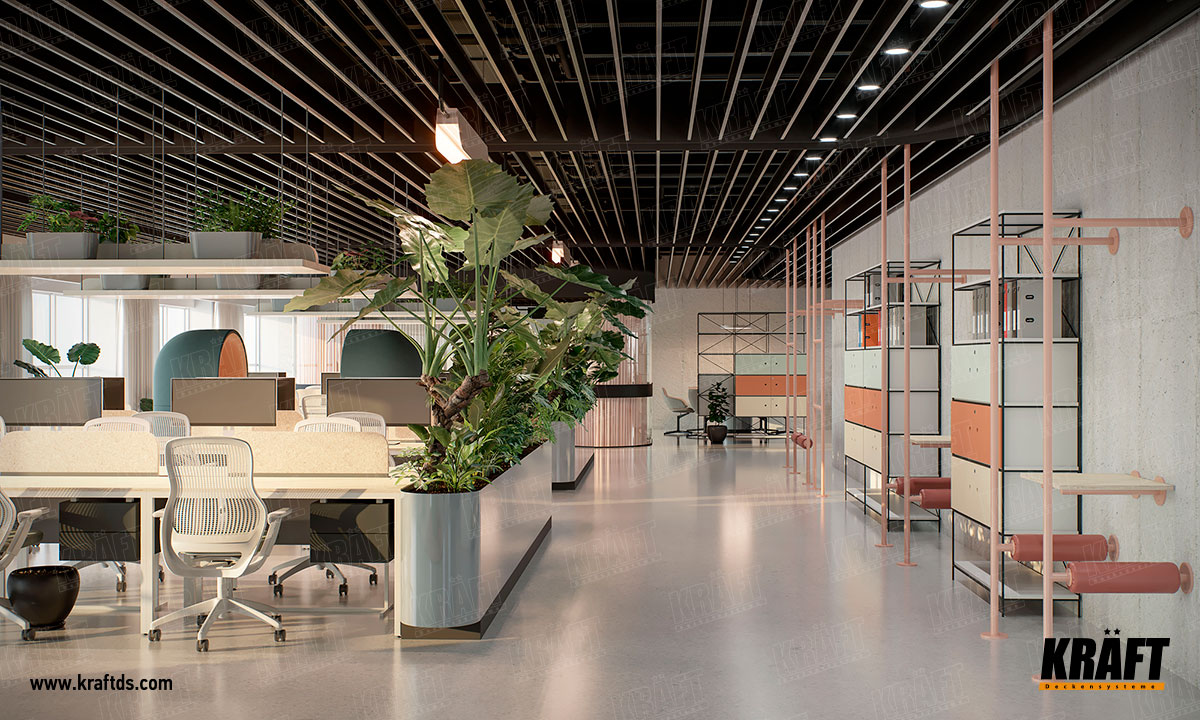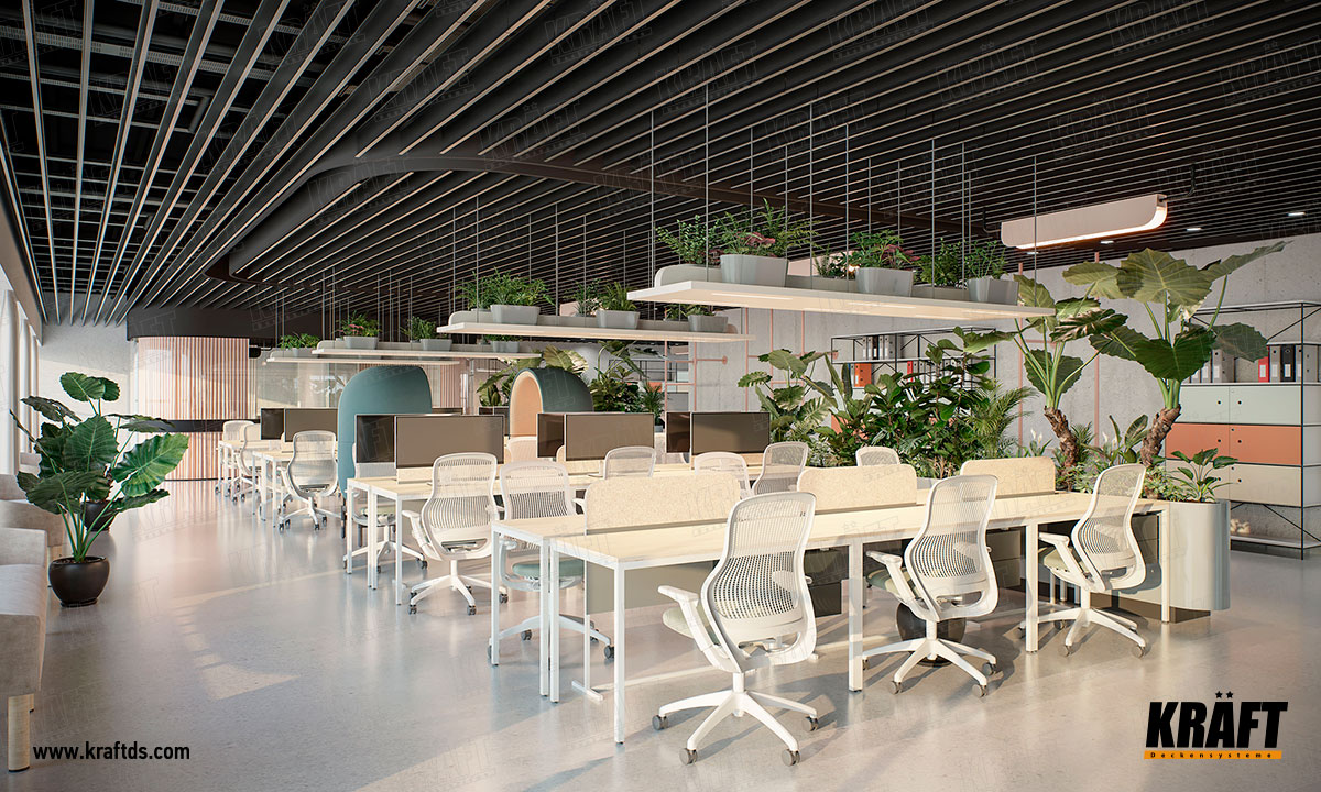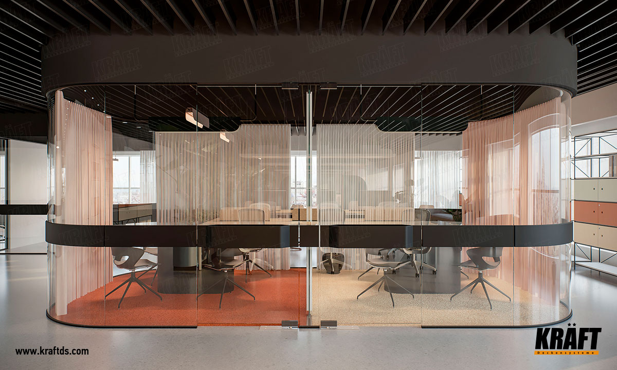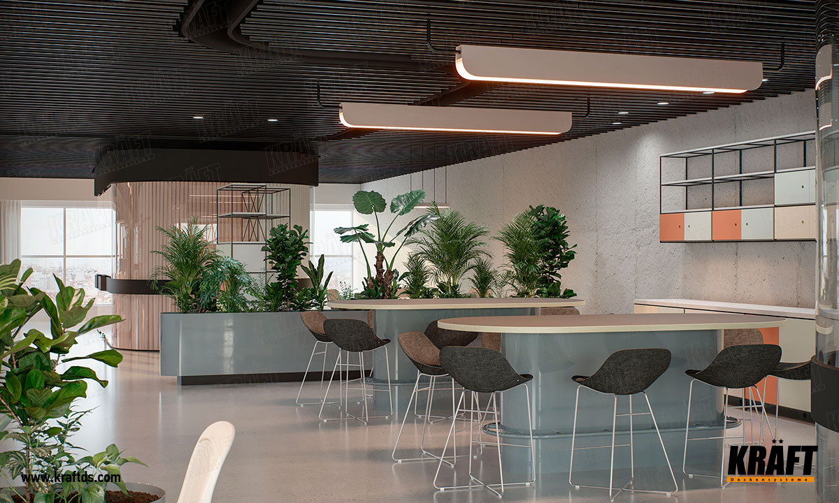 Jak widać na zdjęciu, postanowiliśmy w miarę możliwości pozbyć się negatywnej energii w biurze. Szklane ściany i przegrody, sofy, donice, stoły do jadalni, oprawy sufitowe i inne elementy wnętrza po zaokrągleniu ostrych krawędzi wyglądają nie tak groźnie :). Aby spotęgować efekt, płynne linie zostały powtórzone nawet na suficie. Wydawałoby się, że sufit ekranowy KRAFT to nic innego jak płaskie listwy, jak można je zaokrąglić?Wszystko jest możliwe, gdy się do tego przyłożysz. Kształt sufitu podwieszanego KRAFT podąża za krzywiznami powierzchni w biurze i naszym zdaniem promieniuje pozytywną energią!